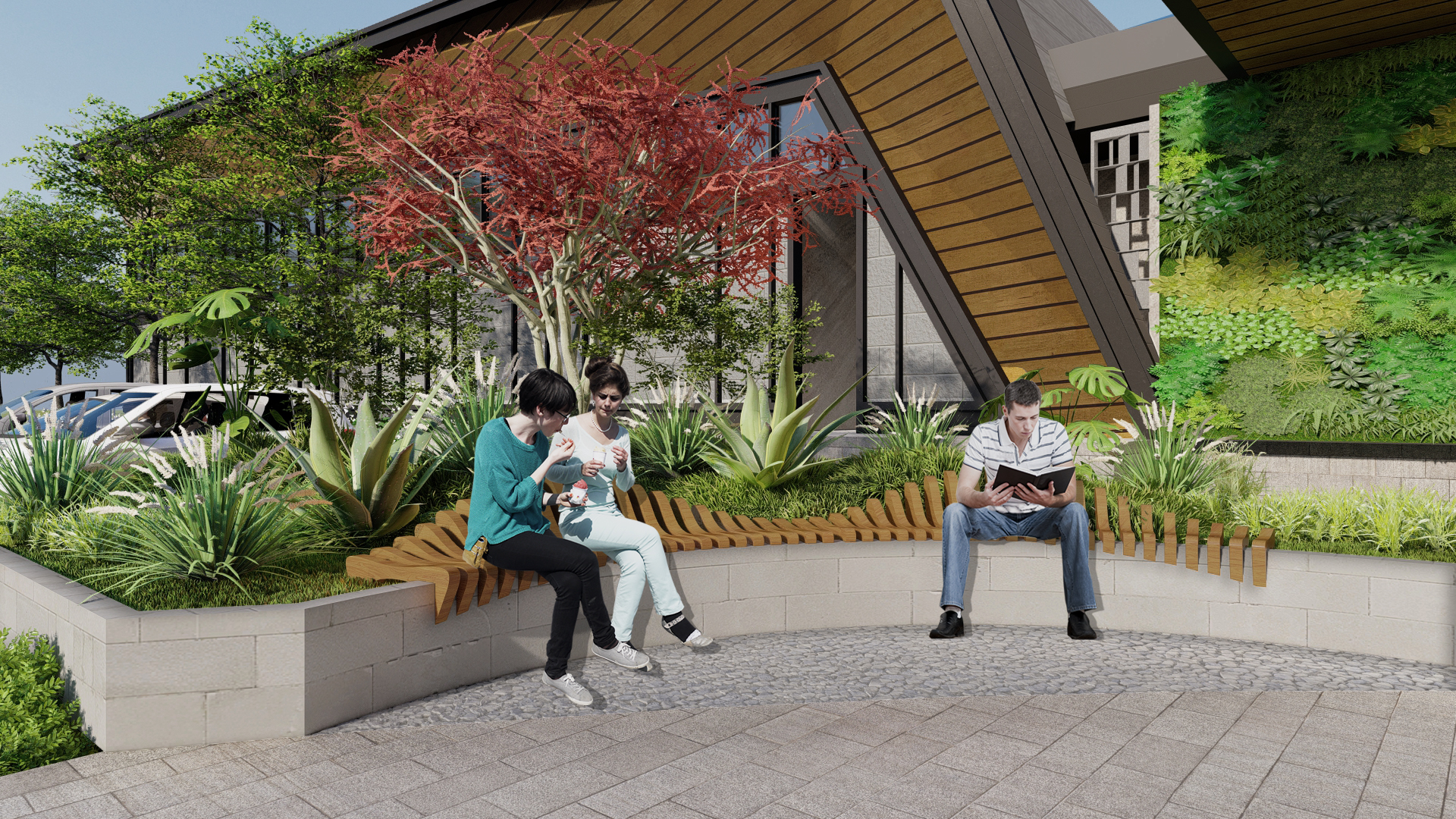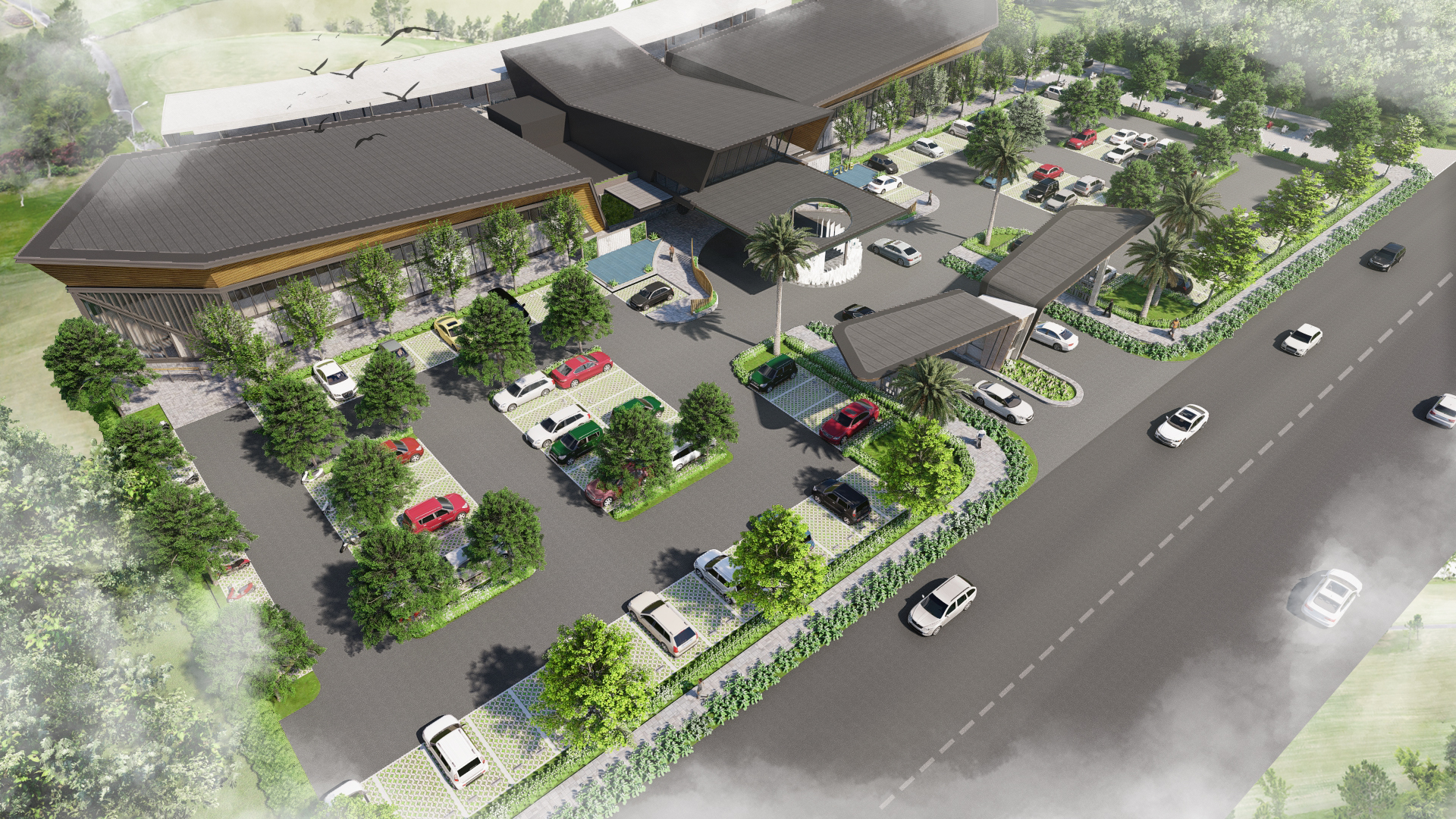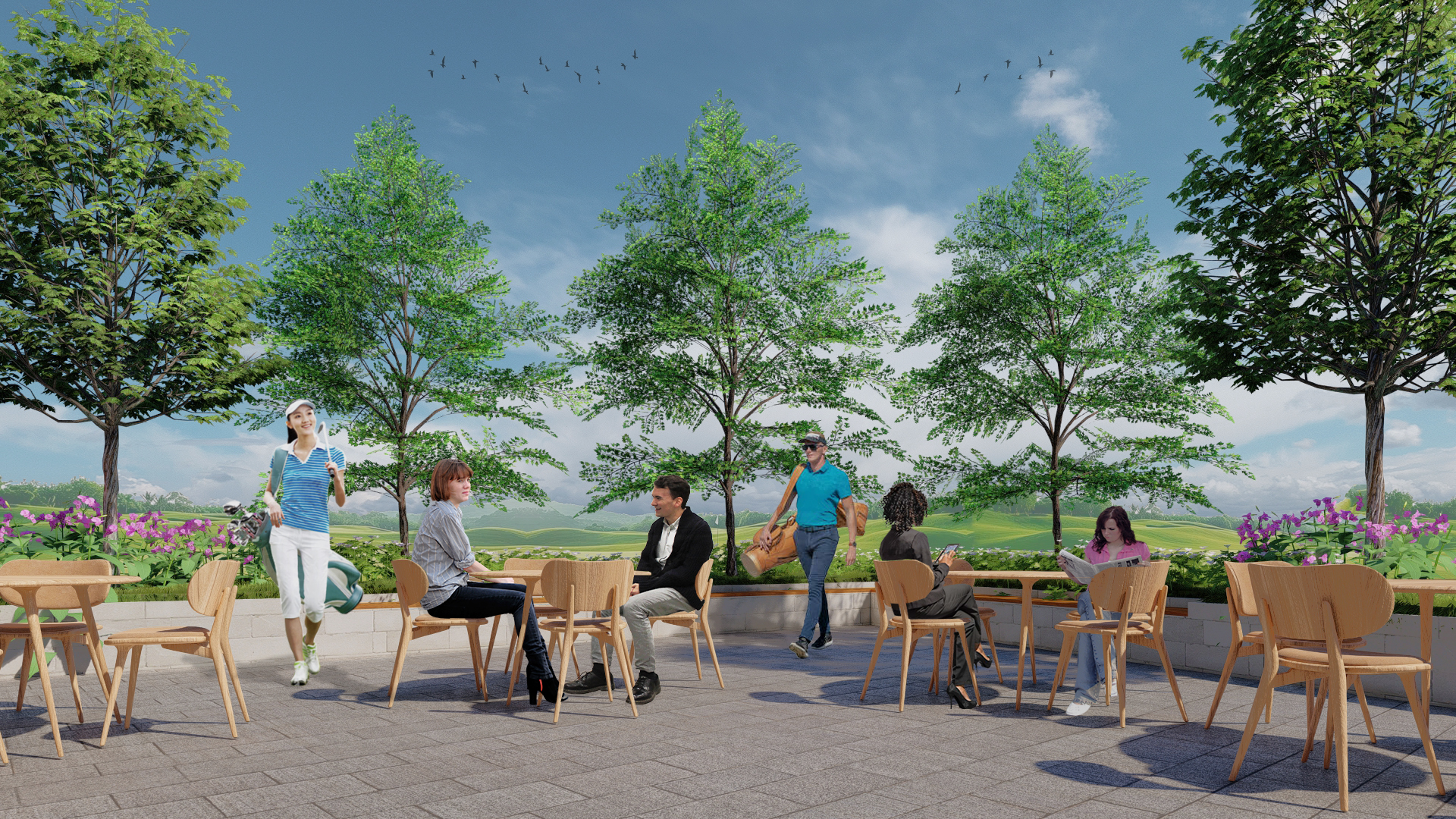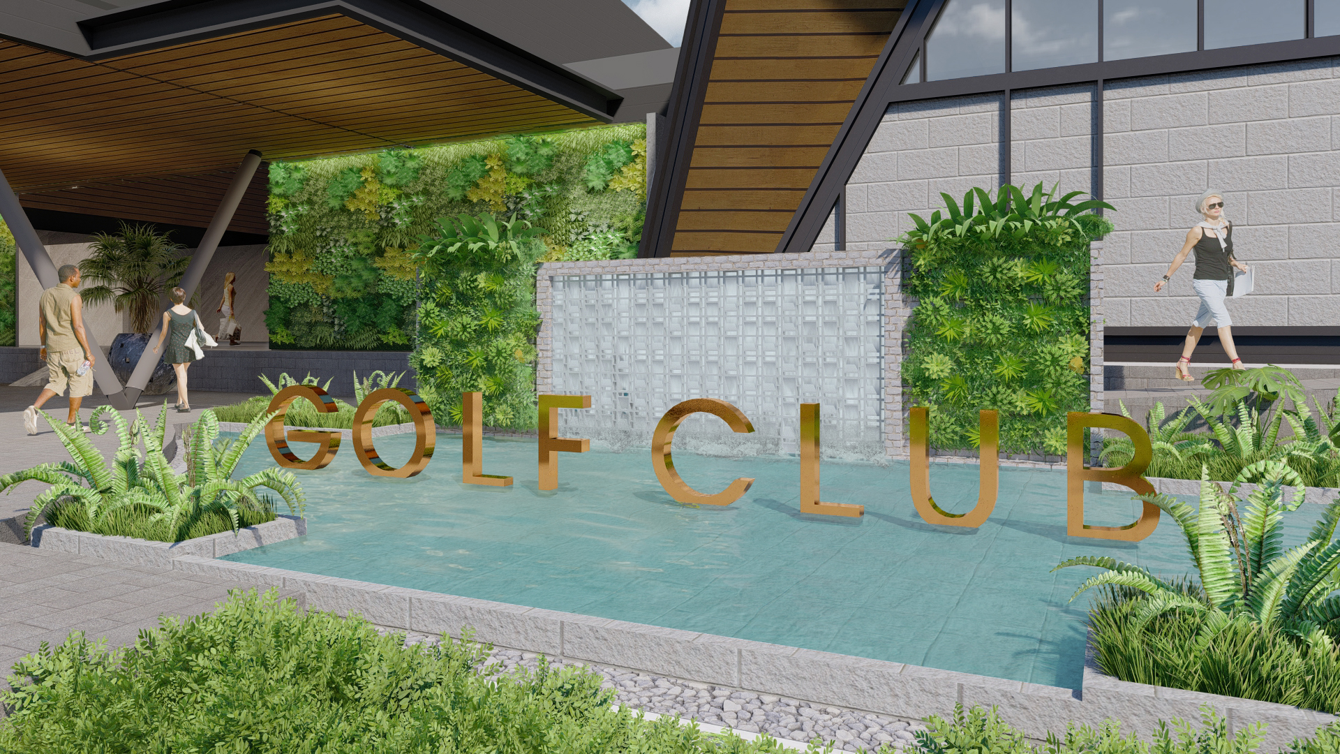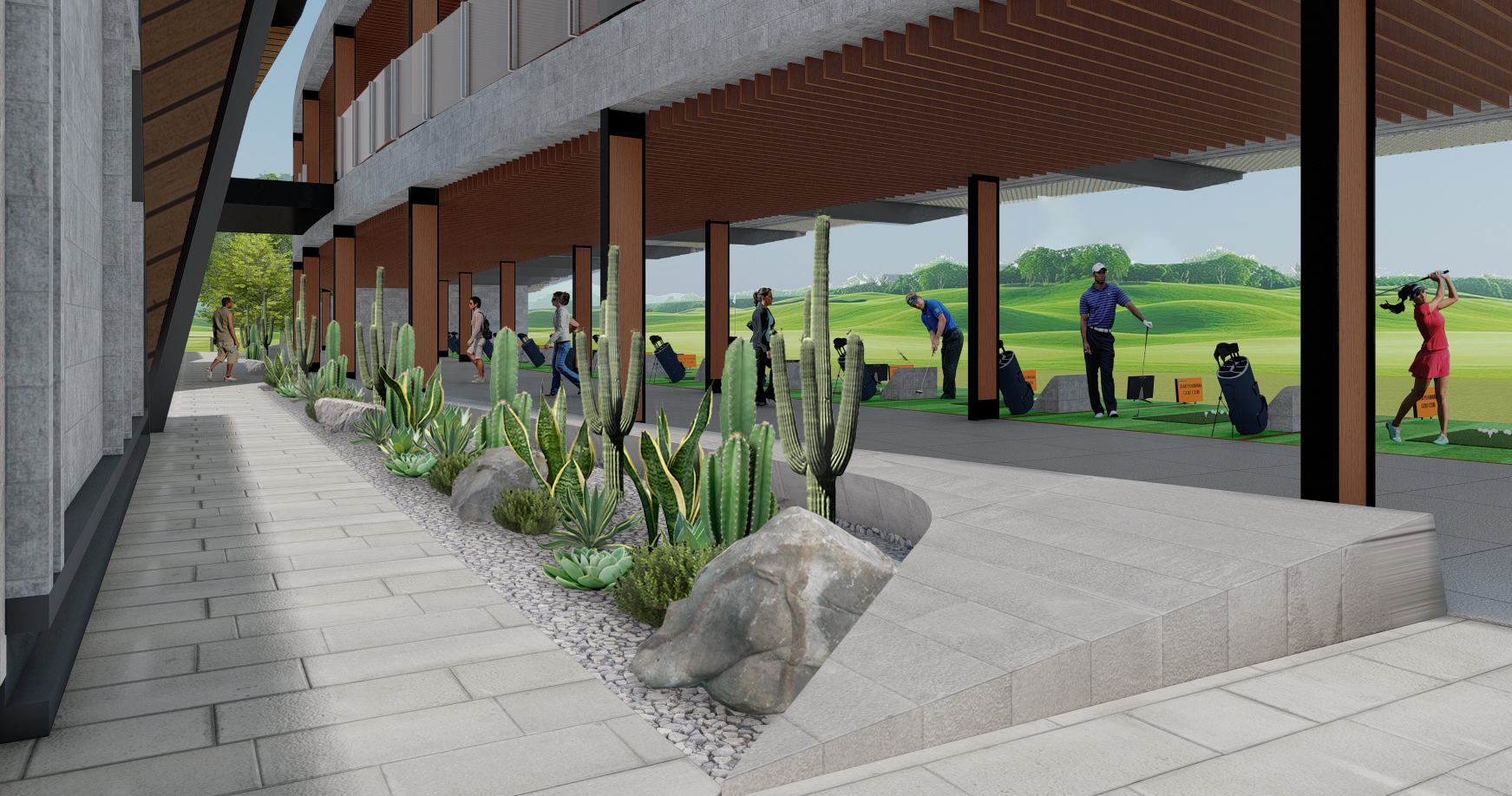 The golf course clubhouse landscape design features a Modern Minimalism approach with clean lines, simple forms, and a restrained plant palette for a serene environment. It integrates textured hardscape and softscape elements such as pathways, seating, and water features with lush greenery to balance aesthetics and functionality. Emphasizing sustainability, the design incorporates sustainable practices that enhance biodiversity, reduce environmental impact, and improve air quality, ensuring a cohesive, inviting, and refreshing space for visitors.